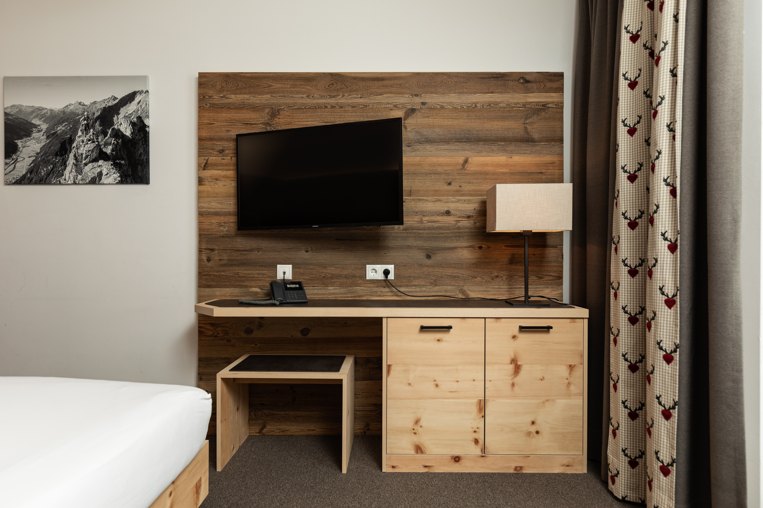 modern und freundlich eingerichtete Standard Doppelzimmer im Neubau, in einer Kombination aus Altholz und Zirbe oder in Räuchereichenholz möbliert